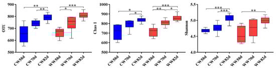 Effects of drinking WW on the diversity of the cecal bacterial community (n = 9–15). CW, cold water group; WW, warm water group. Values are shown as means ± SEM. Differences were analyzed by one-way analysis of variance followed by the least-significant difference post hoc test. * p < 0.05, ** p < 0.01, *** p < 0.001.
