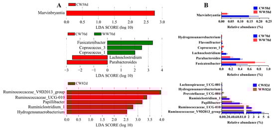 Alteration of the microbial genera among the different groups (n = 9–15). (A) Genera that are differentially represented between the groups drinking warm and cold water identified by LEfSe (linear discriminant analysis score > 2, p < 0.05). (B) Significantly different genera among the different groups are shown, based on p < 0.05 by the Wilcoxon rank-sum test. CW, cold water group; WW, warm water group.