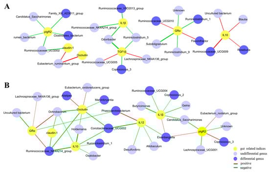 Correlation analysis between microbiota abundance and gut-related indices. Spearman’s rho non-parametric correlation was applied, and significant relationships with q < 0.05 are shown. (A) Correlation between the microbiota and gut-related indices in WW groups. Yellow nodes: Gut-related indices, referring to immune and tight junction-associated gene expression in WW groups. Blue nodes: Differential genus, referring to the genera that significantly differed between the groups (WW vs. CW) or markedly increased with age (day 58 vs. 82) in WW groups. Light blue nodes: Undifferential genus, referring to genera that were not significantly different between the groups (WW vs. CW) or did not markedly increase in abundance with age (day 58 vs. 82) in WW groups. (B) Correlation between the microbiota and gut-related indices in CW groups. Yellow nodes: Gut related indices, referring to immune and tight junction-associated gene expression in CW groups. Blue nodes: Differential genus, referring to the genera that significantly differed between the groups (WW vs. CW) or markedly increased with age (day 58 vs. 82) in CW groups. Light blue nodes: Undifferential genus, referring to the genera that were not significantly different between the groups (WW vs. CW) or did not markedly increase in abundance with age (day 58 vs. 82) in CW groups. Red lines indicate positive correlations between nodes (r ≥ 0.4), and green lines indicate negative correlations (r ≤ −0.4). The thickness of the lines is proportional to the obtained r values. CW, cold water group; WW, warm water group.