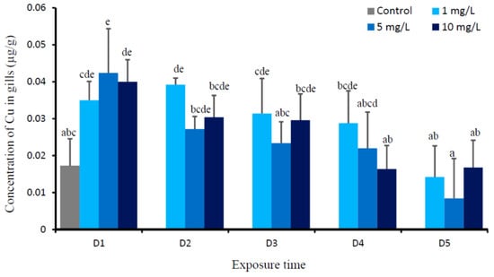 Mean concentration of Cu (µg/g) in gills of O. niloticus of the control group and after exposed to 1, 5, and 10 mg Cu/L. Different lowercase letter indicates significance difference according to Tukey multiple comparison test (P < 0.05).