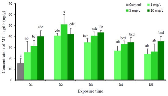 Mean concentration of metallothionein (MT) (ng/g) in gills of O. niloticus of the control group and after exposed to 1, 5, and 10 mg Cu/L. Different lowercase letter indicates significance difference according to Tukey multiple comparison test (P < 0.05).
