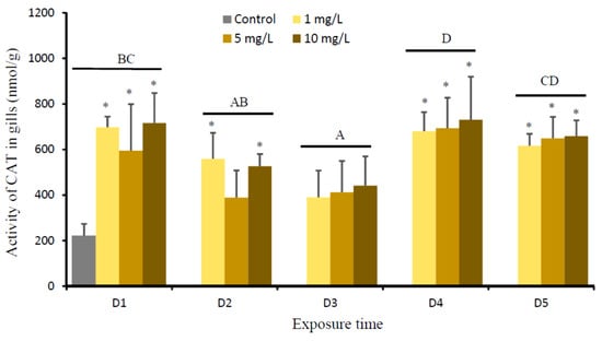 Activity of catalase (CAT) (nmol/g) in gills of O. niloticus of the control group and after exposed to 1, 5, and 10 mg Cu/L. Different capital letter indicates significance difference of time effect on CAT according to Tukey multiple comparison test (P < 0.05). Asterisk indicates significance difference of Cu effect on CAT for each time group as compared to the control (P < 0.05) according to Tukey multiple comparison test.
