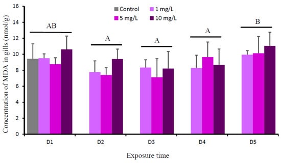 Mean concentration of MDA (nmol/g) in gills of O. niloticus of the control group and after exposed to 1, 5, and 10 mg Cu/L. Different capital letter indicates significance difference between the experimental day (time) for each treatment group on MDA (P < 0.05) according to Tukey multiple comparison test.