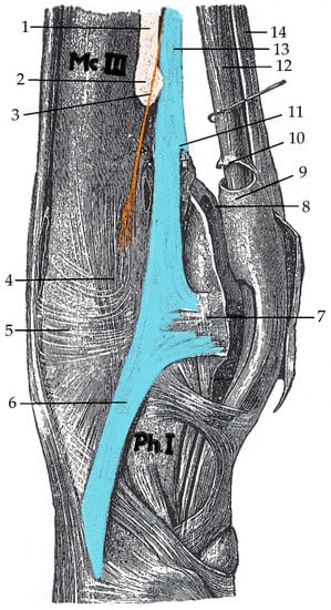 The medial view of the metacarpophalangeal joint in the equine right foreleg. The metacarpal II and its distal nodule (beige) and rudimentary tendon of the interosseous muscle II (orange) are noted. The medial branch of the interosseus III muscle, its bifurcation into medial and lateral branches of the interosseus III muscle have been depicted (blue). Adapted from Schmaltz 1911 [17]. Mc.III–metacarpal III; Ph.I–phalanx I; 1. metacarpal II (beige); 2. distal nodule metacarpal IV (beige); 3. rudimentary tendon of the interosseous muscle II (orange); 4. Medial collateral ligament of the metacarpophalangeal joint; 5. anterior fascia of the metacarpophalangeal joint; 6. medial branch of the interosseus III muscle (blue); 7. medial aspect of the collateral sesamoidean ligament; 8. intersesamoidean ligament; 9. manica flexorium; 10. proximal aspect of the digital tendon sheath; 11. bifurcation of the branches of the interosseus III muscle; 12. deep digital flexor tendon (DDFT); 13. interosseus III muscle; 14. superficial digital flexor tendon (SDFT).