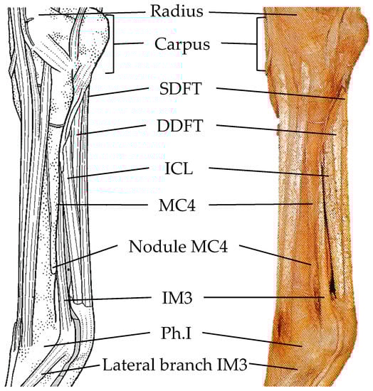 Left foreleg: the lateral view of the carpus, metacarpal III, metacarpophalangeal joint and proximal phalanx I with major soft tissue structures. Adapted from Ashdown and Done [20]. SDFT: flexor digitorum superficialis, DDFT: flexor digitorum profundus, ICL: profundus ligamentum accessorium or inferior check ligament, MC4: metacarpal IV, IM3: interosseous muscle III.