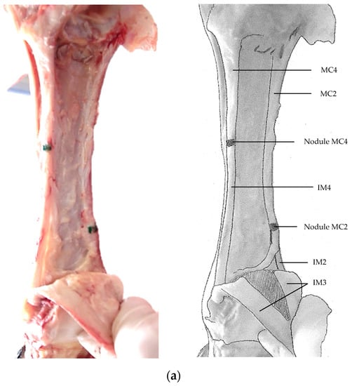 In the modern horse, polydactyl atavism or primitive characteristics have been reported in the appendicular skeleton and although considered rare, as have reports of atavistic or vestigial soft tissue structures in the distal limb. [12,13,14,15]. Evidently, these soft tissue structures were once strong and functional in the polydactyl, but now, the morphology is regarded as rudimentary and ineffectual (Figure 1) [12,15]. However, two atavistic soft tissue structures reported in the forelegs; the medial or II interosseous muscle (IM2) and lateral or IV interosseous muscle (IM4) are of interest to this study. Both are vestigial remnants of medial and lateral limb reduction, but in the modern horse, there is only one interosseous muscle considered functional—the middle or interosseous muscle III (IM3) [12,13,14,15,16]. This muscle (IM3) evolved even further and now contains a large number of strong ligamentous fibres with elastic properties that functionally support the metacarpophalangeal joint (fetlock joint) when the limb is either standing, or during locomotion [15,16].