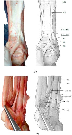 In this study, the presence of a strong cord-like band resembling a tendon or ligament in the distal limb was identified and described in four species of the genus Equus. The bands originated from the distal nodules of MC2, MC4, MT2 and MT4, corresponding to the previously reported description of the atavistic IM2 and IM4 [12,15]. However, in contrast to a thin and feeble ligamentous structure, morphological variations in size and insertion were noted, with conspicuous cord-like bands inserting into corresponding branches of the IM3 (Figure 3a–c). The described bands were observed in one domestic breed (BMH) out of 18 in E. caballus; one primitive breed (DK) out of one in E. caballus; three out of three in E. asinus (donkeys); nine out of nine in E. przewalskii (Przewalski’s horse) and one out of one in a E. quagga boehmi (Grant’s zebra).