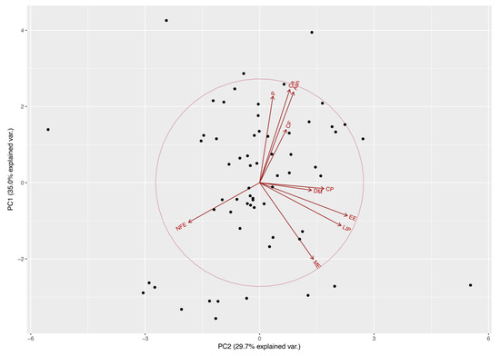 Variances (i.e., eigenvalues) for the first four principal components (PC1−PC4) were greater than one (>1) and, altogether, they explained more than 85% of the variability found in the original variable (i.e., nutrients). These components allowed us to summarize our data into multivariate linear regression analyses, without losing information or minimizing such loss. In particular, the values for these components (expressed as percentages) were 34.98%, 29.70%, 13.87%, and 10.37%, respectively. Eigenvectors (Table 1) from these four components confirm that some nutrients are correlated. Four major nutrient groups were identified, specifically: a mineral component (Ca, P, and ash) in PC1, a lipid component (LIP and EE) in PC2 (see Figure 1 and Figure 2); DM and NFE in PC3; and CF in PC4. Furthermore, the linear regression analysis between principal components and the preference of Diet A by cats revealed a borderline significance for the effects of PC1 (Ca, P, and ash), PC2 (LIP and EE), and PC4 (CF) over the food preferences of cats (p = 0.059, p = 0.055 and p = 0.053, respectively).