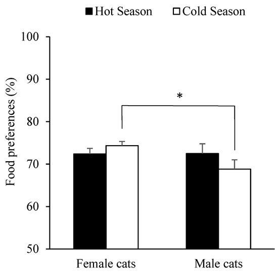 Cat’s food preferences mean and standard errors of most consumed diets (Diet A) after two feeder 20-h preference tests according to animal’s sex (females or males) and climate season (hot or cold). * p < 0.05.