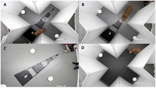 The plus-shaped maze was realized with plastic panels 2.0 m high and placed inside the experimental room. All arms of the maze were 0.8 m long, 0.60 m wide and had a door at their end. The central area of intersection between the four arms had a dimension of 0.60 × 0.60 m. The maze flooring was covered with grey polyvinyl chloride flooring (PVC). The spatial references provided to the dogs to orient themselves had been placed inside the maze: alternating strips of grey and black PVC were arranged in triangle shape on the floor across one of the two axes of the maze and a 0.50 m high stake was placed at the 0.50 m from the base of the triangle. Two empty bowls were placed in the two opposite arms lateral to the starting point. All the elements outside the maze (e.g., room door, walls, etc.) were covered by white curtains to prevent dogs from using them as spatial references.