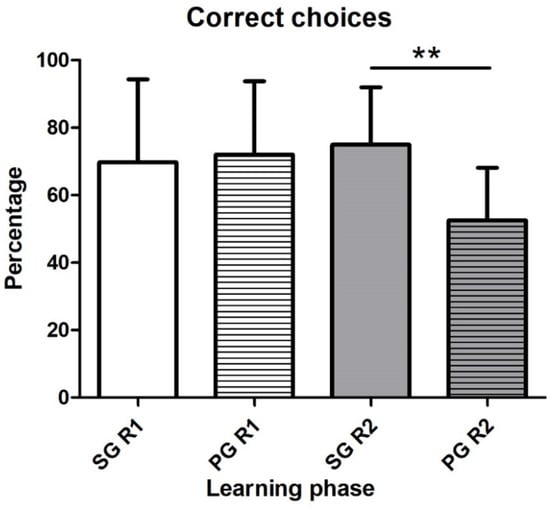 Considering overall the learning phase (i.e., including all the repetitions of the task), the dogs of the SG passed the phase with percentages of correct choices of 69.76 ± 24.57 % in round 1 and 74.99 ± 16.96 in the round 2. For the PG, the percentages of correct choices were 71.97 ± 21.81% in the round 1 and 52.49 ± 15.68% in the round 2. There was no difference between two groups in the round 1, whereas in round 2 the SG made more correct choices in percentage than PG (Mann–Whitney U = 13.00, p < 0.01; Figure 2). Compared to the performances in round 1, the PG showed a tendency to decrease correct choices in percentage for the learning phase in round 2 (Wilcoxon test, W = 33.00, p = 0.05).