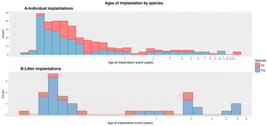 A and B: Showing the apparent age at microchip implantation for both dogs and cats in the electronic patient records for (A) individuals and (B) litters. Red = cats, blue = dogs.