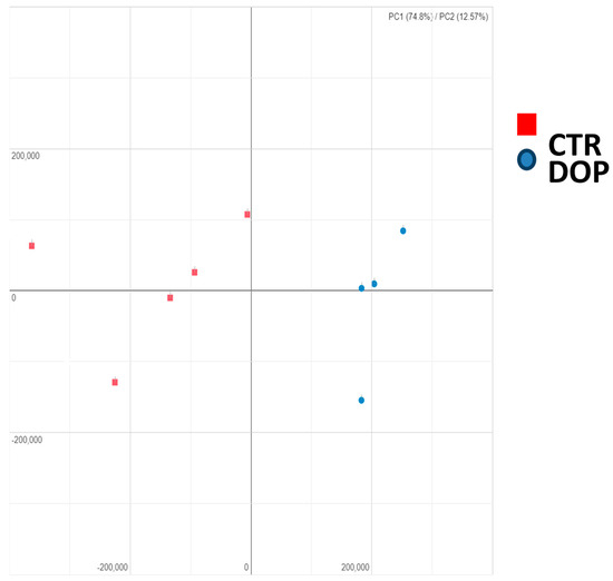 In order to study the effect of dried olive pomace on the transcriptome in laying hens, we collected peripheral blood from both the control group (CTR) and the experimental group (DOP) at the end of the supplementation period. Applying a false discovery rate (FDR) <0.05, we identified 2148 differential expressed genes (DEGs) (Supplementary Table S1). This presented the possibility to clearly separate the two groups using principal component analysis (PCA)—with the first two components amounting to about 87% (Figure 1)—further confirming the homogeneity of the samples.