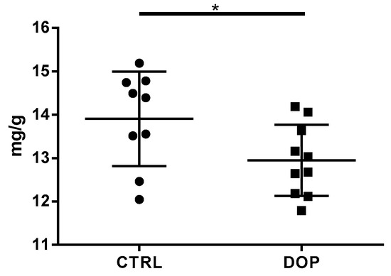 Because we found several downregulated genes belonging to the cholesterol biosynthesis pathway, we decided to assess the cholesterol content in egg yolk from the CTR and DOP groups at the end of the supplementation period. As expected, we found a significant decrease egg yolk cholesterol amount between the control group and the birds fed a diet with 10% dried olive pomace supplementation (13.91 ± 0.36 vs. 12.95 ± 0.24, p: 0.043) (Figure 3).