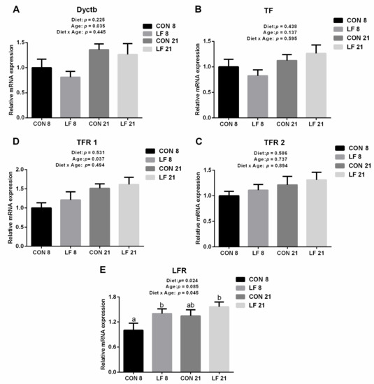 3.3. Effects of Lactoferrin on the Expressions of Gene and Protein Related to Iron Metabolism in the Duodenum of Suckling Piglets