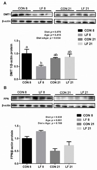 - Pu, Y.; Li, S.; Xiong, H.; Zhang, X.; Wang, Y.; Du, H. Iron promotes intestinal development in neonatal piglets. Nutrients 2018, 10, 726. [Google Scholar] [CrossRef] [PubMed]