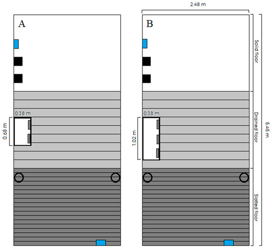 Drawing of pen dimension and design for (A) pens with a high space allowance of 1.21 m2/pig (11 pigs) and (B) pens with a low space allowance of 0.73 m2/pig (18 pigs). The white rectangle represents the feeder, and the solid black squares represent two wooden beams in separate vertical racks. The hollow, black circles represent drinking cups, while the blue rectangles represent temperature sensors. All pens had the same dimensions.