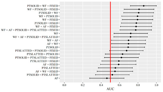 AUC (area under the ROC curve) with 95% confidence intervals (CI) for each Bayesian ensemble of models on water flow (WF), activation frequency (AF), pen temperature above the solid floor (PTSOLID), pen temperature above the slatted floor (PTSLATTED) and the fixed probability (FIXED) for the alarm type UNTIMED (day-1, day-2 and day-3). If the CI does not overlap with the red vertical line, the final updated model has a predictive performance better than random guessing.