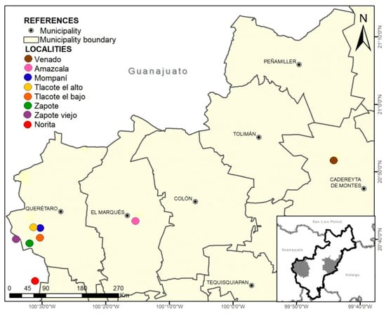 The study was carried out with 226 animals (216 females and 10 males) that, per dentition, were proved to be older than one year of age. The animals were distributed across eight localities in central Mexico: Norita (n = 20) and Zapote viejo (n = 38), belonging to the state of Guanajuato; Venado (n = 11), Amazcala (n = 15), Tlacote el alto (n = 22), Tlacote el bajo (n = 38), Zapote (n = 59) and Mompaní (n = 23), belonging to the state of Querétaro (Figure 1).