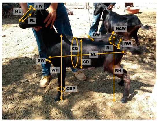 The influence of each variable can change from one population to another and it is difficult to compare among populations. This is the case for the CBP, which for the Canindé breed is the variable that has the least contribution in the model (18.5%) [32], compared with the BCG (66%) and local goats in India (87%) [34]. As reported by other authors, the variation shown is the result of the absence of selection or it is also produced because different parts of the body are more affected by the environment than by other factors. However, head length is important in several studies due to its close relationship with the cranial bone, which is not strongly influenced by other factors [12].