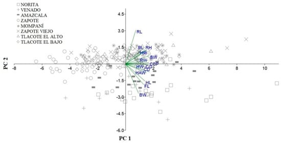 A principal components analysis (PCA) was performed to reduce the matrix of morphometric variables to a small number of non-correlated variables called components. The main components obtained were evaluated based on Kaiser’s criterion (eigenvalue > 1) [20].