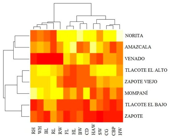 Finally, a hierarchical analysis of conglomerates using Ward’s method was carried out using the Euclidean distance to construct a dendrogram and to evaluate the distances among localities. Morphometric variables were also included in this analysis and a heatmap was generated to visualize the relationship among the localities and their average per variable. All statistical analyses were performed using the statistical programming language R [21].