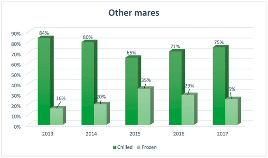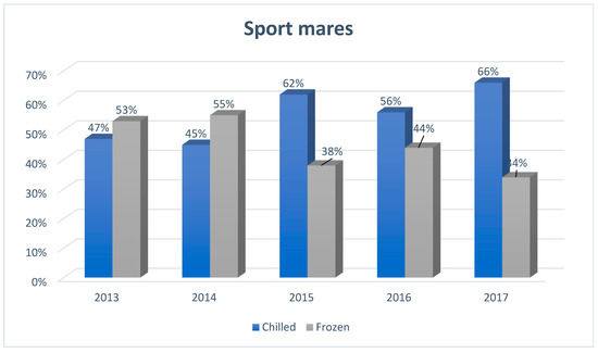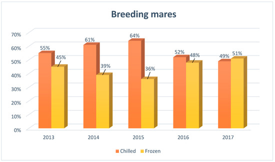 Initially, in the period of 2013–2015, the use of chilled semen in the artificial insemination of breeding mares significantly prevailed over frozen, representing 55% (2013), 61% (2014) and 64% (2015) of all breeding mares submitted to insemination in the European insemination centers. However, since 2016, there has been a significant increase in the frequency of the use of frozen semen, reaching a similar level as the use of chilled semen.