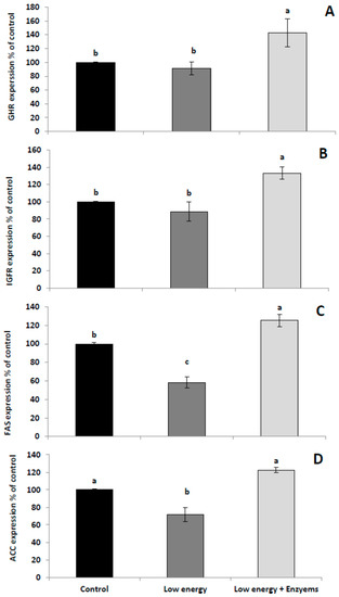 The mRNA expressions of the growth hormone receptor (GHR), insulin-like growth factor receptor (IGFR), and fatty acid synthesis (FAS) were significantly increased by adding Xyl and Abf enzymes to low-energy diets in comparison with the control group (Figure 1A–C). Meanwhile, acetyl-coA carboxylase (ACC) was increased by Xyl and Abf enzyme supplementation to a low energy diet but these differences were not significant in comparison with the control group (Figure 1D). These improvements are confirmed by the previous results of Guo et al., who demonstrated that the addition of Xyl upregulated the expression of the sodium–glucose cotransporter 1 and IGFR genes in broiler chickens [40]. Furthermore, Hosseini et al. reported that the inclusion of Xyl improved the expression of GHR and IGFR genes [41]. Moreover, ACC and FAS encode a biotin-dependent enzyme which is involved in the biosynthesis of fatty acids via the catalyzation of the irreversible carboxylation of acetyl-CoA for malonyl-CoA production [42]. In the present study, ACC and FAS gene expressions were significantly elevated in the low-energy diet supplemented with the Xyl and Abf enzyme combination. This impact was connected with the freedom of blocked macronutrients and, consequently, elevated lipogenesis due to the eternal energy adequacy [43]. Indeed, FAS and ACC, which play important roles in the lipogenic passage, are also key determinants for the maximal ability of a muscle tissue to synthesize fatty acid; they are extremely expressed in tissues such as those of the liver and muscles [3,44]. In common physiological cases, nutritional factors such as high-fat feed and hormones could organize the enzyme activity and gene expression of the FAS and ACC [39,45,46].