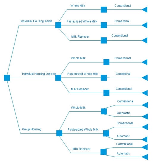 A cost simulation model was developed at the University of Kentucky Dairy Science program during 2018. This economic model was developed in Excel 2013 (Microsoft, Redmond, WA, USA) utilizing @RISK and PrecisionTree add-ons (Palisade Corporation, Ithaca, NY, USA). The base herd used included 1500 milking cows, 1000 replacement heifers in total and 84 heifer calves in the pre-weaning period, assuming a 30% replacement rate and an average age at first calving of 25 months. Costs were calculated on a per head basis for housing, feed, labor, mortality, and health. All remaining variables are static. Interest was accounted for on infrastructure and mortality as well as the depreciation of assets related to replacement females. Costs associated with herd-wide parameters, such as disease prevalence and mortality rates, were distributed across all remaining calves in the pre-weaning phase. The model required a management decision at 3 points: housing type, milk source, and labor shown in Figure 1. Three main housing types were modeled: individual housing outside (IHO), individual housing inside (IHI) [], and group housing (GH). Three milk sources were built into the model: whole milk (WM), pasteurized whole milk (PWM), or milk replacer (MR). Four possible liquid feeding plans were modeled: 6, 8, 10, and 12 L of milk per calf per day. Labor was modeled for two categories: conventional, where a person was assigned to feeding and caring for the calves; or automatic, where an automatic calf feeder was utilized in addition to human labor. Totals costs were reported per calf for each management decision, the entire pre-weaning period per calf, and per day per calf. Per day cost was calculated by dividing days of age at weaning by the total cost per calf during the pre-weaning period.