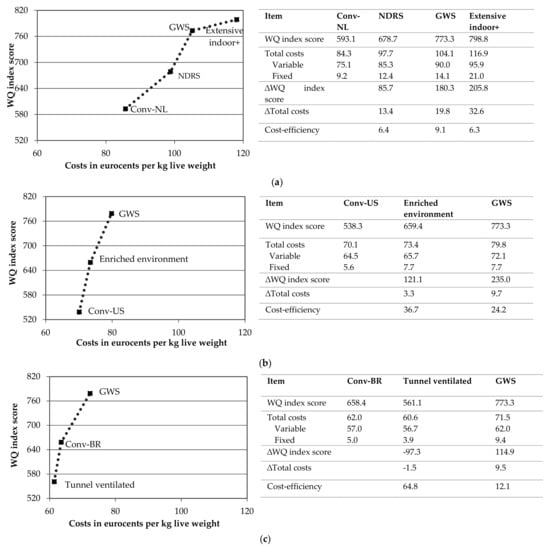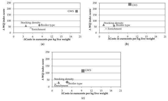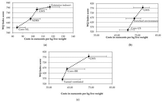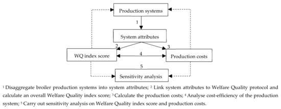 - Gocsik, É.; Brooshooft, S.D.; De Jong, I.C.; Saatkamp, H.W. Cost-efficiency of animal welfare in broiler production systems: A pilot study using the Welfare Quality® assessment protocol. Agric. Syst. 2016, 146, 55–69. [Google Scholar] [CrossRef]