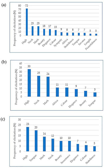 In all the versions of the questionnaire, a word association task investigating respondents’ perceptions about giraffes was included at the beginning of the questionnaire to be sure that the following items did not influence the association. Respondents were asked to write down the first three words [59] that came to their mind when they thought of a giraffe. Three blank spaces to fill in were provided to the respondents. The frequency of elicitation was related to the importance of a concept in consumers’ mind (i.e., visitors in the case of zoos) [60].