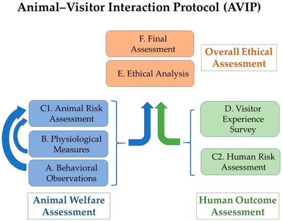 The diagram of the animal–visitor interaction protocol (AVIP). The six steps of the protocol (steps A–F) are shown with their relative connections. Step C is divided into two parts: C1 focuses on animal risk assessment, whereas C2 focuses on risk assessment related to staff and visitors. The steps represented by blue boxes are the ones dedicated to animal welfare assessment. Results of step A and B are the base of step C1. Steps C2 and D are represented by green boxes and focus on human outcome assessment. Step E and F are represented by orange boxes and correspond to the final phase of the protocol being the overall ethical assessment part of the protocol.