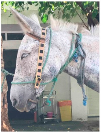 A variety of methods to communicate with mules and hinnies are available, such as bits/bridles, halters/head collars with a variety of nose bands, materials, and widths [32,55,56,57]. Multiple restraint mechanisms with regional application have been noted as well, such as blindfolds, tying up legs, ear and nose twitches [15,39,56] (Figure 6). If a routine health task cannot be safely performed, nose twitches are a successful form of restraint, especially a string twitch with a long handle to hold (Figure 6). The restraint may actually decrease the stress placed on the mule/hinny when it is strongly resisting. As quoted by Fowler [58], the cause for this stress reduction relies on the fact that endorphins are released, lowering the heart rate and increasing tolerance for discomfort associated with procedures performed elsewhere on the limbs or body. Blindfolds used to cover mules’ or hinnies’ eyes are effective methods of calming an animal to receive treatment, including deworming or farrier work (Figure 6).