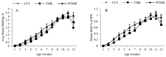 Least square means of feed intake are presented in Table 3. Total milk intake at weaning was numerically less in PTMR than the other two treatments. Average starter DMI kg/d and starter DMI % of BW (Figure 1A,B) were numerically higher for PTMR as compared with CCS and TMR.