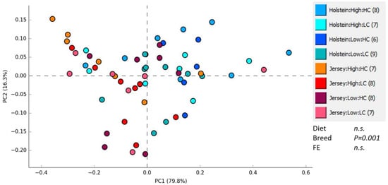 Principal component analysis (PCA) of the methanogen community in the rumen grouped by breed (Holstein or Jersey), residual feed intake (RFI) group (High or Low), and diet (high concentrate: HC; and low concentrate: LC) combinations. Methanogen communities were characterized by T-RFLP analysis on the mcrA gene. The effects of experimental factors were tested using a non-parametric multiple ANOVA on the Bray–Curtis distances.