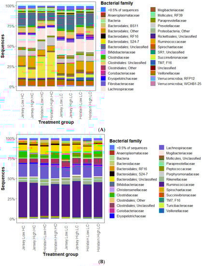Histogram on relative abundance of bacterial community members in rumen (A) and feces (B) grouped by breed (Holstein or Jersey), residual feed intake (RFI) group (high or low), and diet (high concentrate: HC; and low concentrate: LC) combinations. Relative abundances are presented at the family or lowest defined level. Genera marked with ’unclassified’ matched to an unclassified sequence, whereas ‘other’ could not be assigned to a group, because there was no close match in the greengenes database.