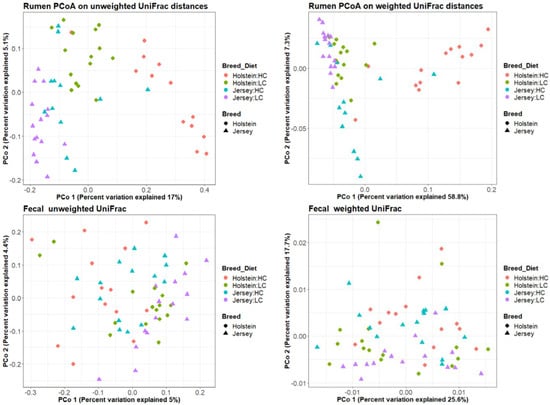 PCoA analysis on UniFrac distances of the microbial communities in rumen (top) and feces (bottom) per breed (Holstein and Jersey) and diet (high-concentrate: HC; and low-concentrate: LC). Left panels are weighted and right panels are unweighted UniFrac distances. Values in parenthesis give the amount of variation explained by each coordinate.