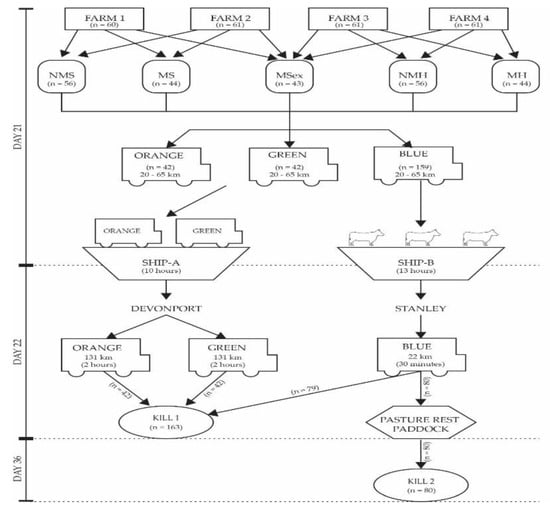 Experiment One consisted of sea and road transport with the allocation of cattle numbers by farm and treatment, detailed in Table 1, and a timeline of the methodology is depicted in Figure 1.