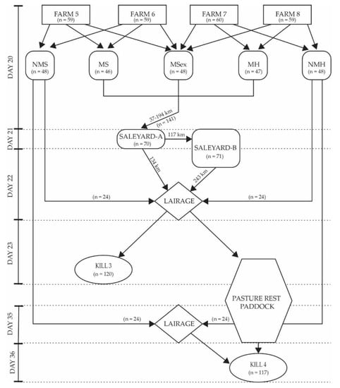 The never mixed cattle for direct slaughter were transported from the farmgate to the processing plant on Day 22 and kept in lairage pens overnight. Day 23 direct slaughter cattle (n = 120) were processed (Kill 3). On Day 35, the remaining never mixed cattle were transported from farmgate to the processing plant and held in lairage pens overnight. Day 36 was the final processing day for all remaining rested cattle (Kill 4, n = 117).