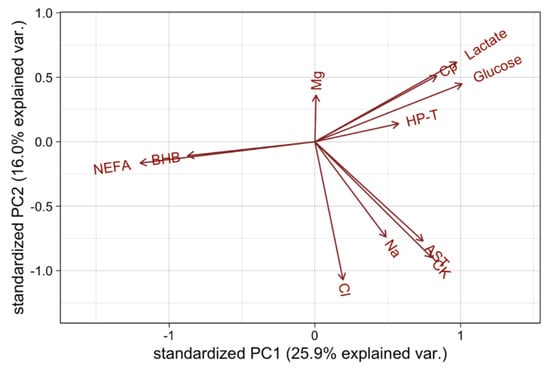 Loadings of each variable on the first and second principal components. NEFA (non-esterified fatty acids), BHB (β-hydroxybutyrate), Mg (magnesium), Cp (ceruloplasmin), HP-T (haptoglobin), AST (aspartate transaminase), CK (creatine kinase), Na (sodium), Cl (chloride)