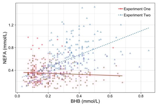 When blood variable correlations were broken into the two separate locations, NEFA had a different pattern in the Experiment One cohort compared with the Experiment Two cattle (Figure 4). NEFA was positively correlated with βHB in Experiment Two but there was no correlation in Experiment One.