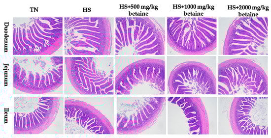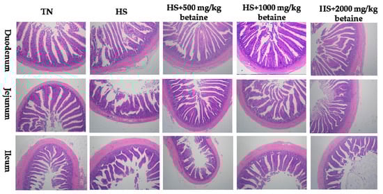 | Dietary Betaine Levels (mg/kg) | Temperature | Duodenum | Jejunum | Ileum | |||