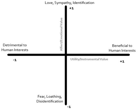 To understand this wide range of attitudes toward domestic dog, Serpell [13] proposes a biaxial model. He suggests that whether viewing individual dogs or the cultural archetype “the dog”, dogs exist on two continuous axes that intersect and interact (see Figure 1). On one axis is the utility of dogs, ranging from detrimental to beneficial to human interests. Beneficial utility includes roles such as those found by Gray and Young [1], while detrimental utility includes disease carriers and dogs who are a potential danger to the humans with whom they share space. The other axis considers the affect related to dogs, ranging from fear and loathing to love and identification. The affect axis may be viewed as encompassing measurable characteristics such as attachment, appreciation for the symbolism of the animal, or the willingness to sympathize [14].