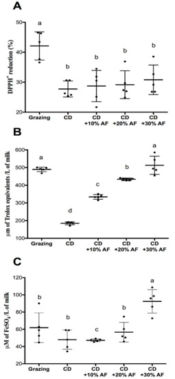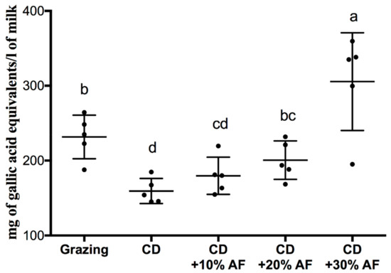 - Cuchillo, H.M.; Puga, D.C.; Navarro, O.A.; Pérez-Gil, R. Antioxidant activity, bioactive polyphenols in Mexican goats’ milk cheeses on summer grazing. J. Dairy Res. 2010, 77, 20–26. [Google Scholar] [CrossRef]
