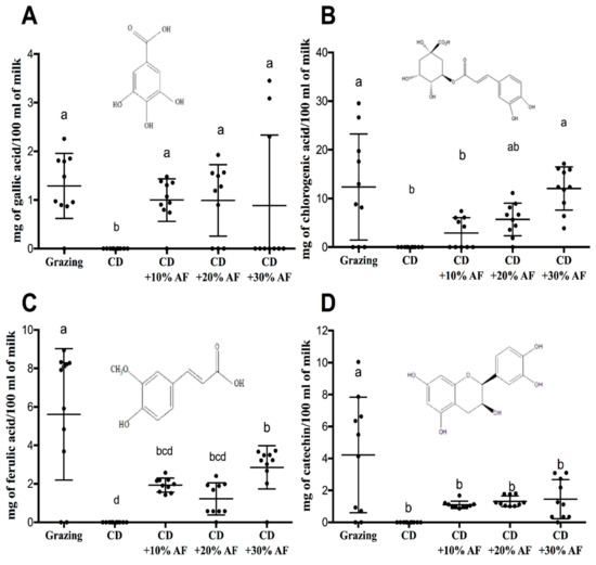 - Chávez-Servín, J.; Andrade-Montemayor, H.; Velázquez Vázquez, C.; Aguilera Barreyro, A.; García-Gasca, T.; Ferríz Martínez, R.; Olvera Ramírez, A.; de la Torre-Carbot, K. Effects of feeding system, heat treatment and season on phenolic compounds and antioxidant capacity in goat milk, whey and cheese. Small Rumin. Res. 2018, 160, 54–58. [Google Scholar] [CrossRef]