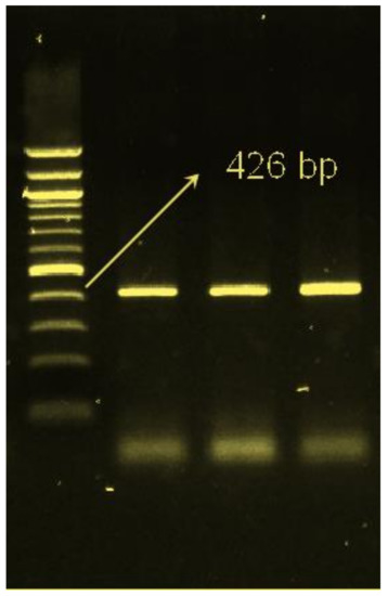 PCR product of the CLPG mutation (426 bp) visualized using 1.5% agarose.