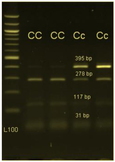 PCR-RFLP results for CLPG gene by BsmFI restriction enzyme on 2% agarose gel. PCR products produced segments of 395 bp and 31 bp for mutant allele c and 278 bp, 117 bp, and 31 bp for wild type allele C.