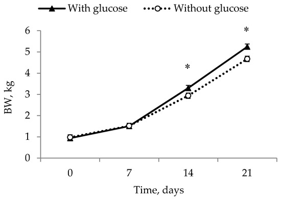 Therefore, the objective of the present study was to investigate the effect of administering IUGR piglets with an energy supplementation three times during the first 24 h after birth, on whole-blood glucose, body weight (BW) gain, and rectal temperatures from birth to day 21 in an on-farm trial. Piglets were placed under a heating lamp for one hour and placed at the same nursing sow suitable for rearing small piglets, to eliminate competition and variability within treatment. We hypothesised that a bolus of porcine colostrum or glucose injection, or both, at birth would have a positive effect on the BW gain, whole-blood glucose levels and rectal temperatures from birth to day 21 in IUGR affected piglets.