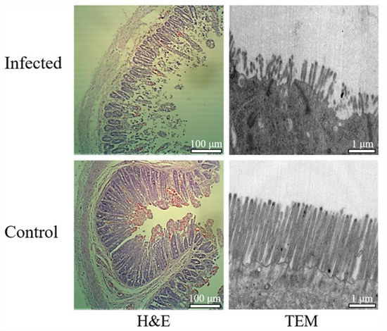 Histopathological analyses of the jejunum tissues derived from porcine epidemic diarrhea virus (PEDV)-infected and control animals. H&E: hematoxylin and eosin staining, TEM: Transmission electron microscopic.