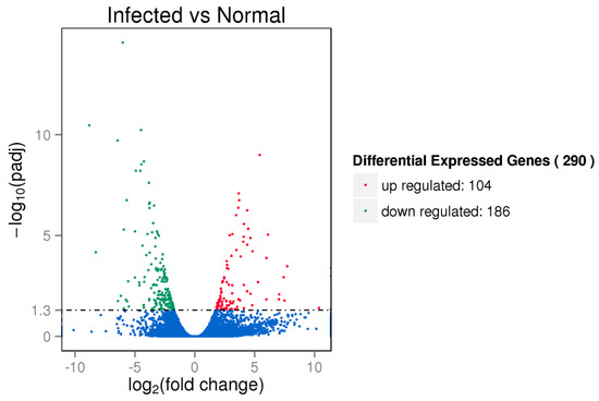 To reveal the transcriptomic differences between the infected and control samples, we performed differential gene expression analysis. In total, 290 differential expression genes were identified (adjusted p < 0.05), with 104 up-regulated genes and 186 down-regulated genes (Figure 2). The differential expression genes are listed in Table S4. The K-means clustering analysis was then conducted to classify genes with similar biological functions. The differential expression genes were clustered into six clusters (clusters 1 to 6), which consisted of 3, 9, 26, 157, 66, and 29 genes respectively (Figure S4; Table S5). To gain insight into the biological functions of differential expression genes, we performed gene ontology annotations and found that these genes were significantly enriched in chemokine activity, chemokine receptor binding, and G-protein coupled receptor binding (Table S6). Pathway analysis revealed the genes were significantly enriched in pathways such as linoleic acid metabolism, mineral absorption, and galactose metabolism (Table S7).